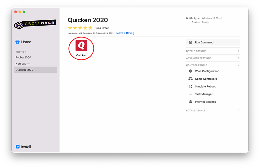 Select the program's bottle from the Bottles section of the left sidebar, and then select the program's launcher.