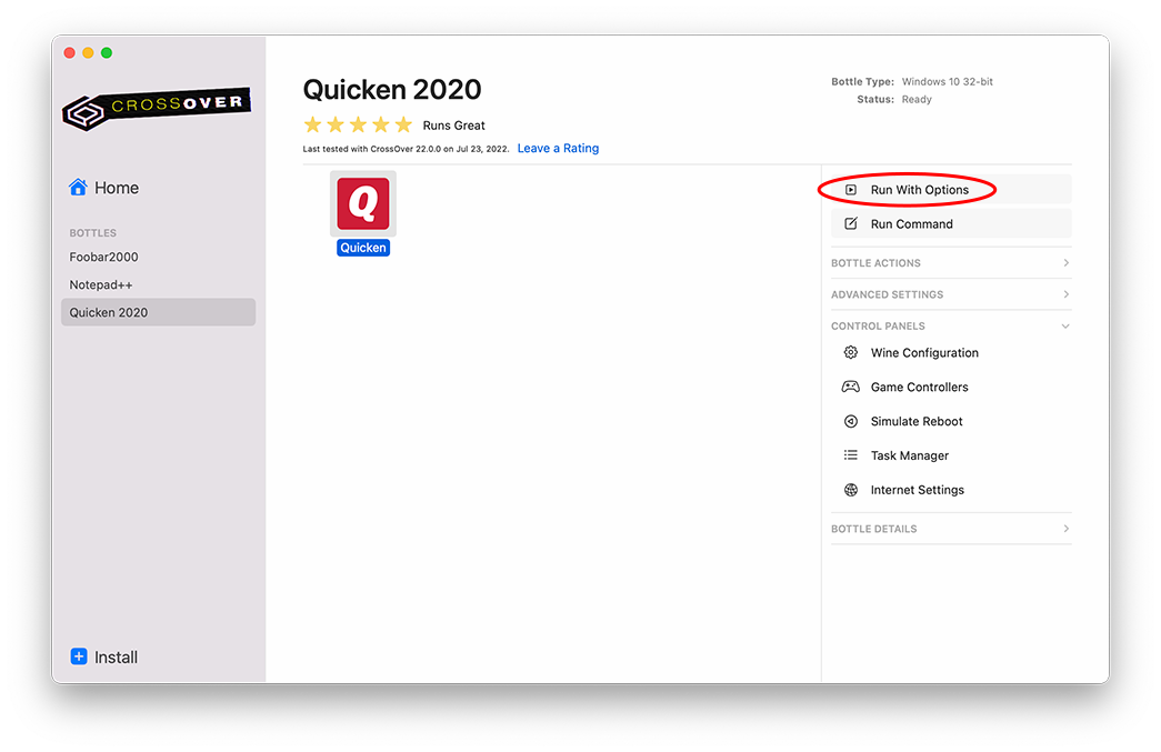 In the right sidebar, click Run with Options.