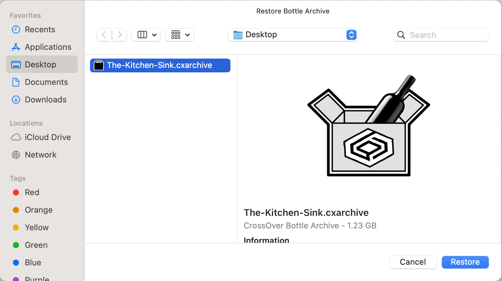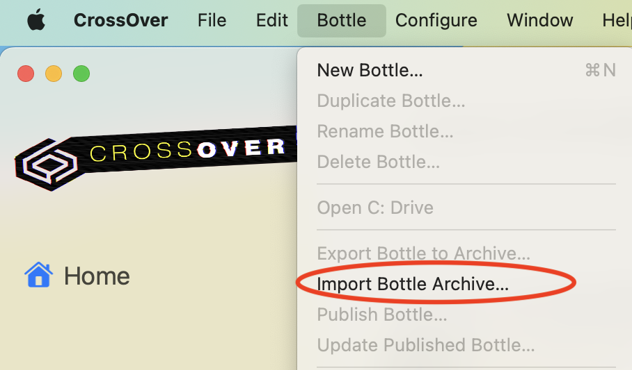 Once the download is complete, import the archive into CrossOver by going to the Bottle menu and select Import Bottle Archive.