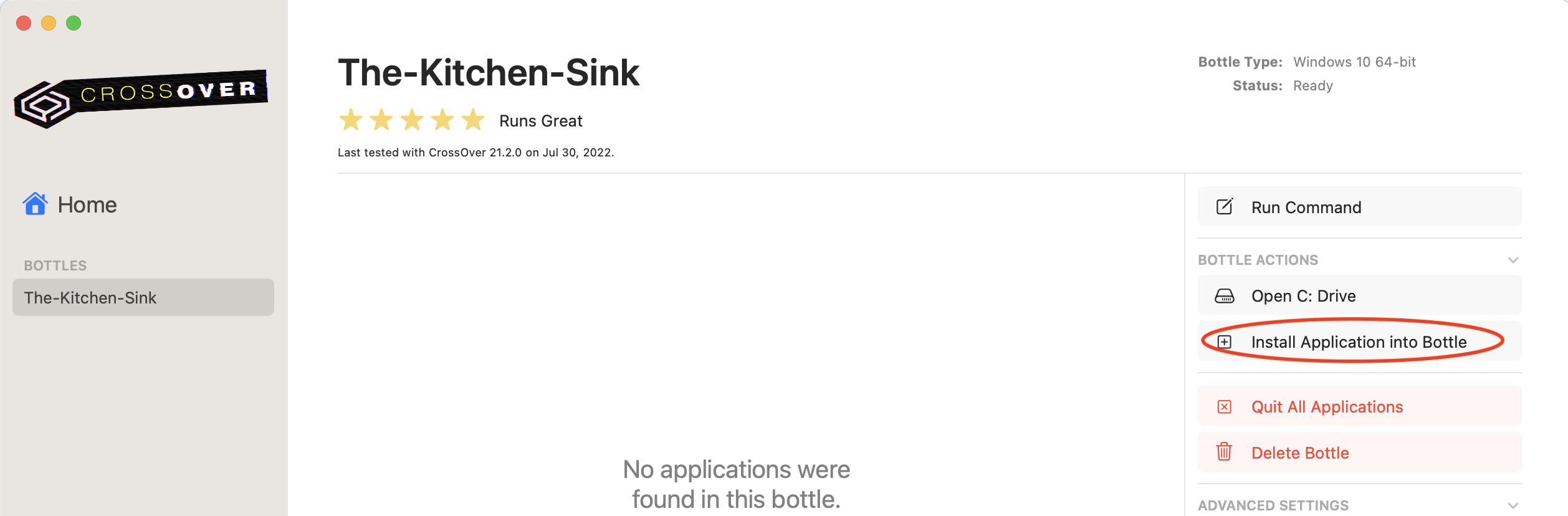 In the following example The Kitchen Sink archive is downloaded and imported into CrossOver. This archive contains many dependencies pre-installed, and once imported into CrossOver you can try installing your Windows application into the same bottle and see if it's able to run.