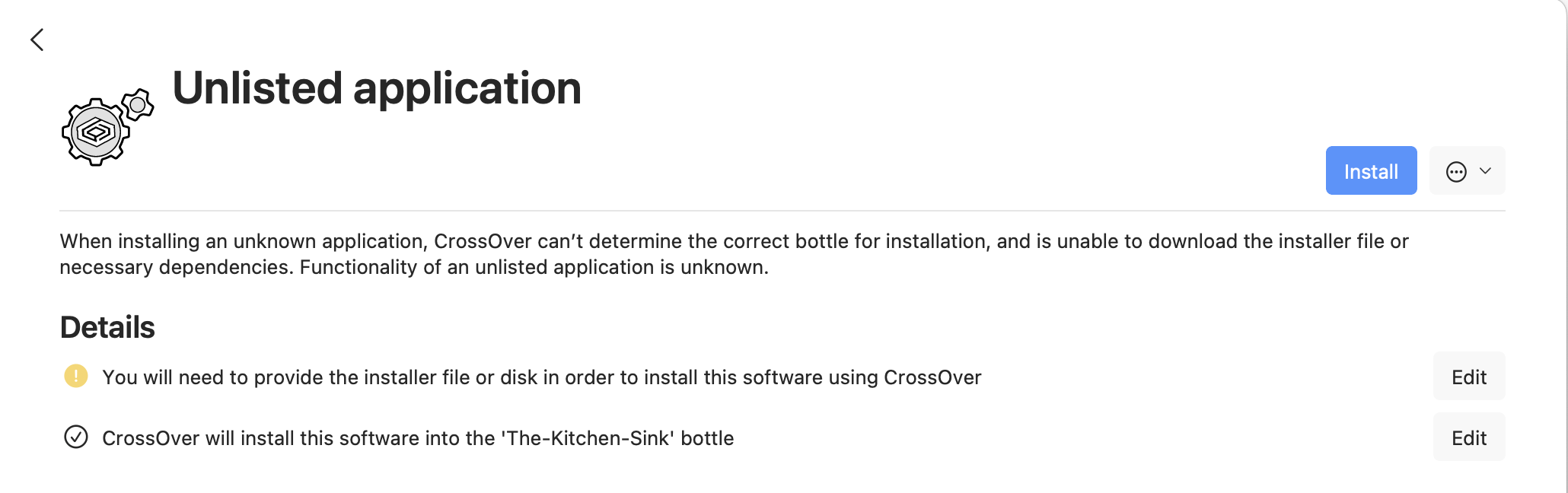 An unlisted application is an application that does not have a CrossTie, or installation recipe, in CrossOver's application database. CrossOver does not default any install details for unlisted applications, so they may not run correctly or at all. But if you’re willing to experiment, it might be possible to get an unlisted application working.