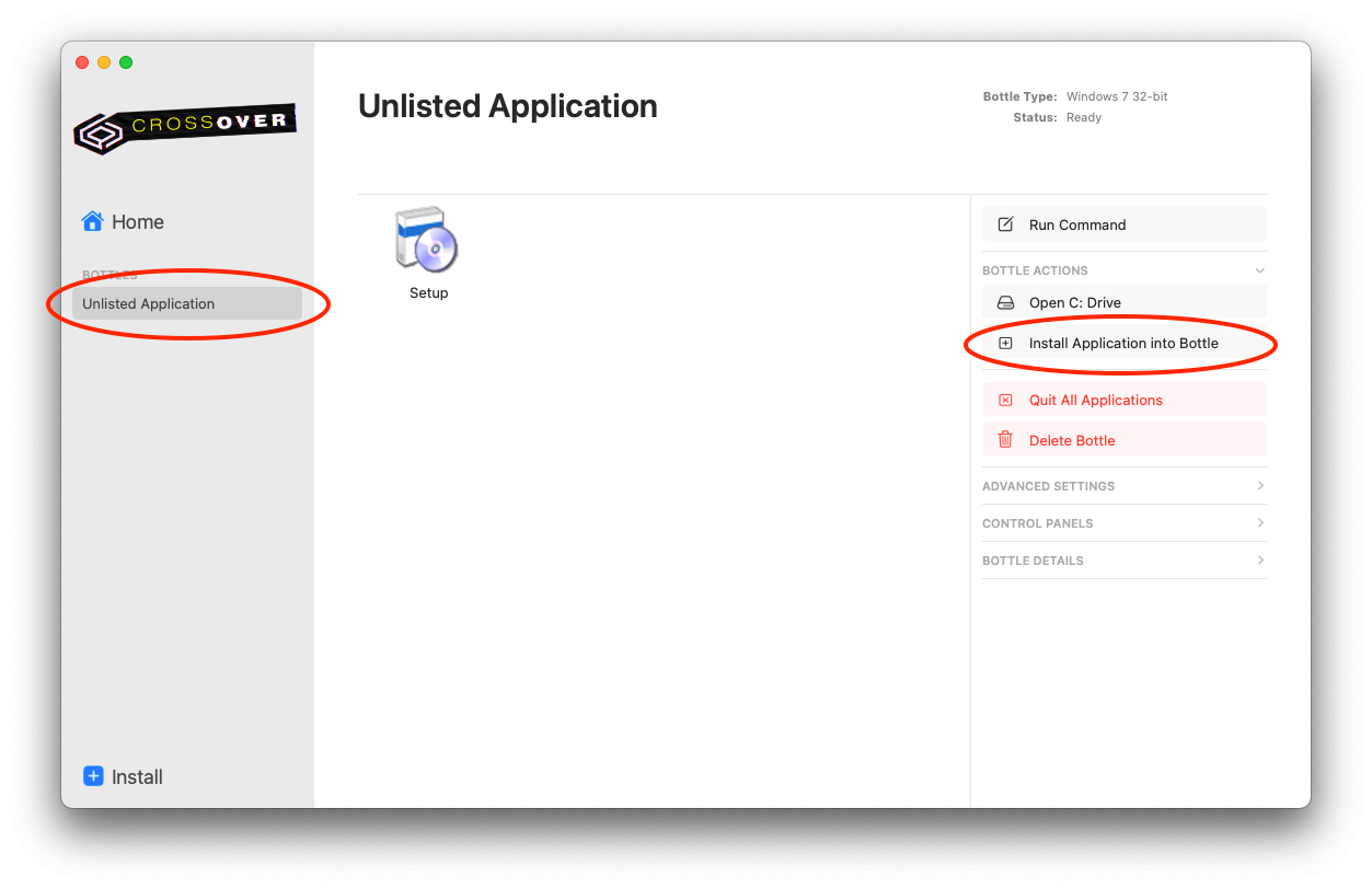 Note that CrossOver has identified the bottle you selected as the bottle for installation, so you just need to select your installer and click Install.