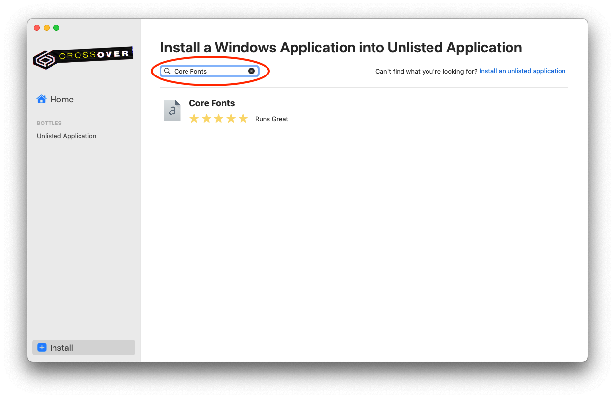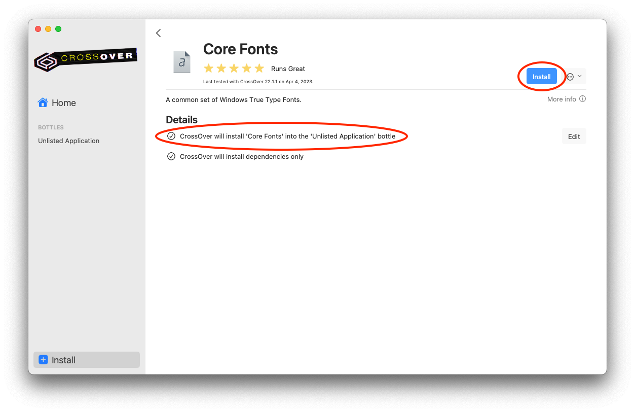 Finally, click Install. Note that CrossOver has identified the bottle you selected as the bottle for installation.
