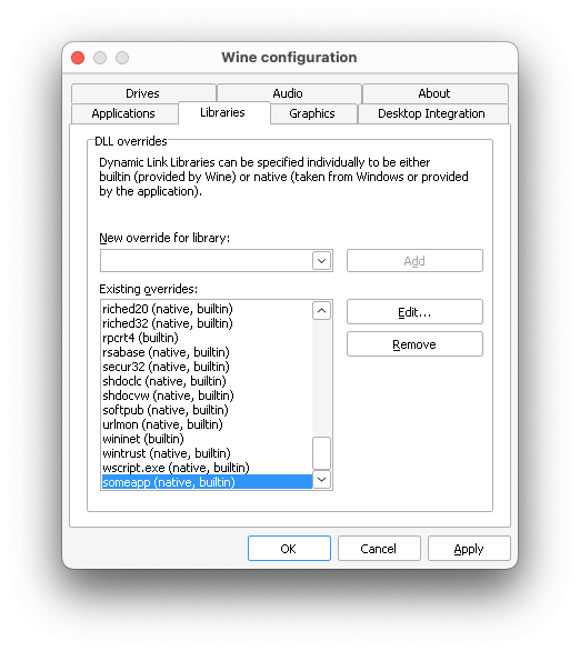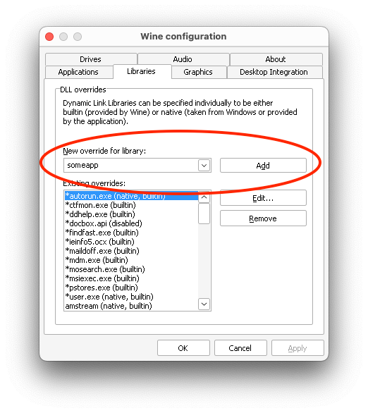 If your application installs a custom DLL, for example called SOMEAPP.DLL, you can add that DLL here and tell Crossover to default to using the native DLL instead of trying to translate the API command using Wine's replacement DLLs. To add a new DLL, enter the name of the DLL in New override for library and click Add.
