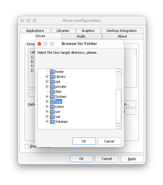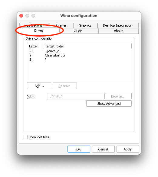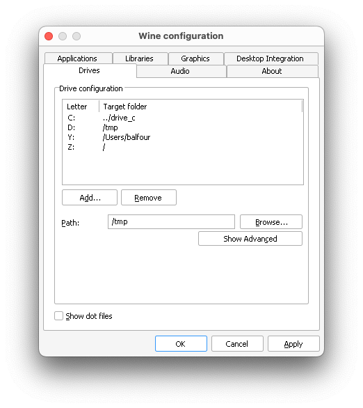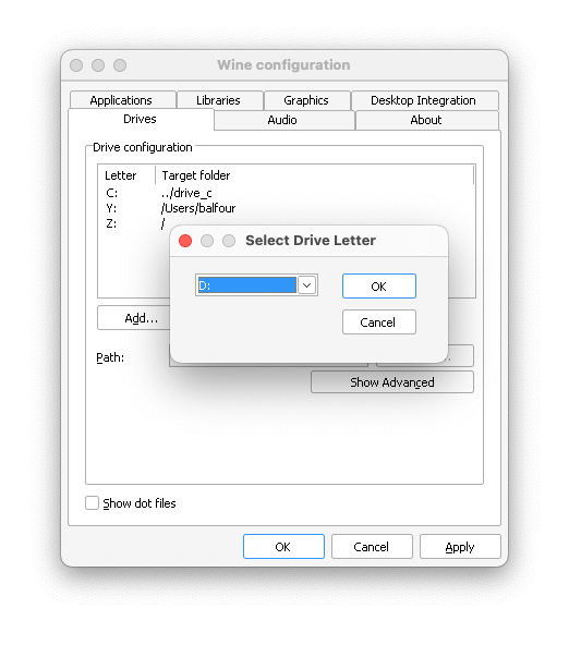 Map a new drive letter (Drives tab) — CrossOver creates and maps three drive letters in each bottle. The C:' drive points to the root of the bottle, the 'Y:' drive to your home folder, and 'Z: points to the root of your hard drive. External drives or removable drives like CDs, DVDs, and USB sticks are automatically given a drive letter when mounted by the OS. In some cases, a program wants its CD/DVD mounted before it'll run as a type of copy protection. Click Add, choose the D: drive, and set it to the CD/DVD.