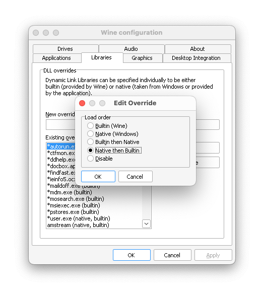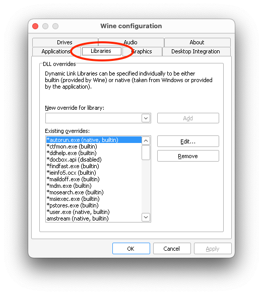 Changing DLL Overrides (Libraries tab) — Crossover by default tries to handle all API commands your Windows program wants to use. Using the Libraries tab you can tell Crossover to pass the API commands to use a native Windows DLL instead.