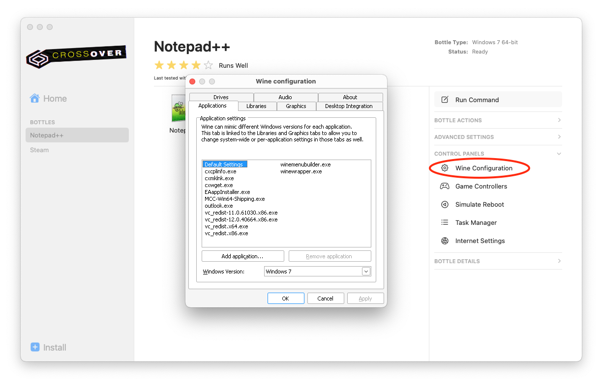 The Wine Configuration tool allows you to make changes to bottle settings. This tool is quite powerful and incorrect settings may damage the bottle and require it to be deleted.